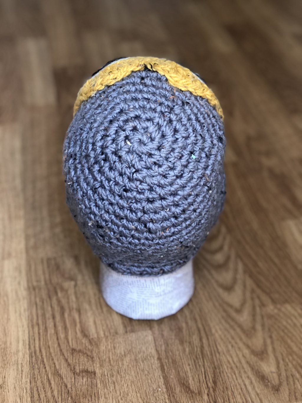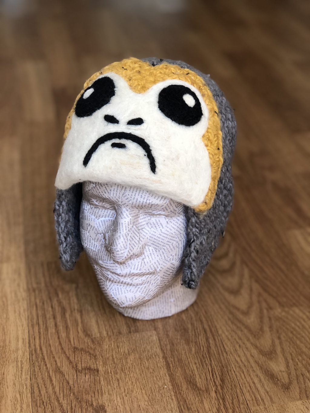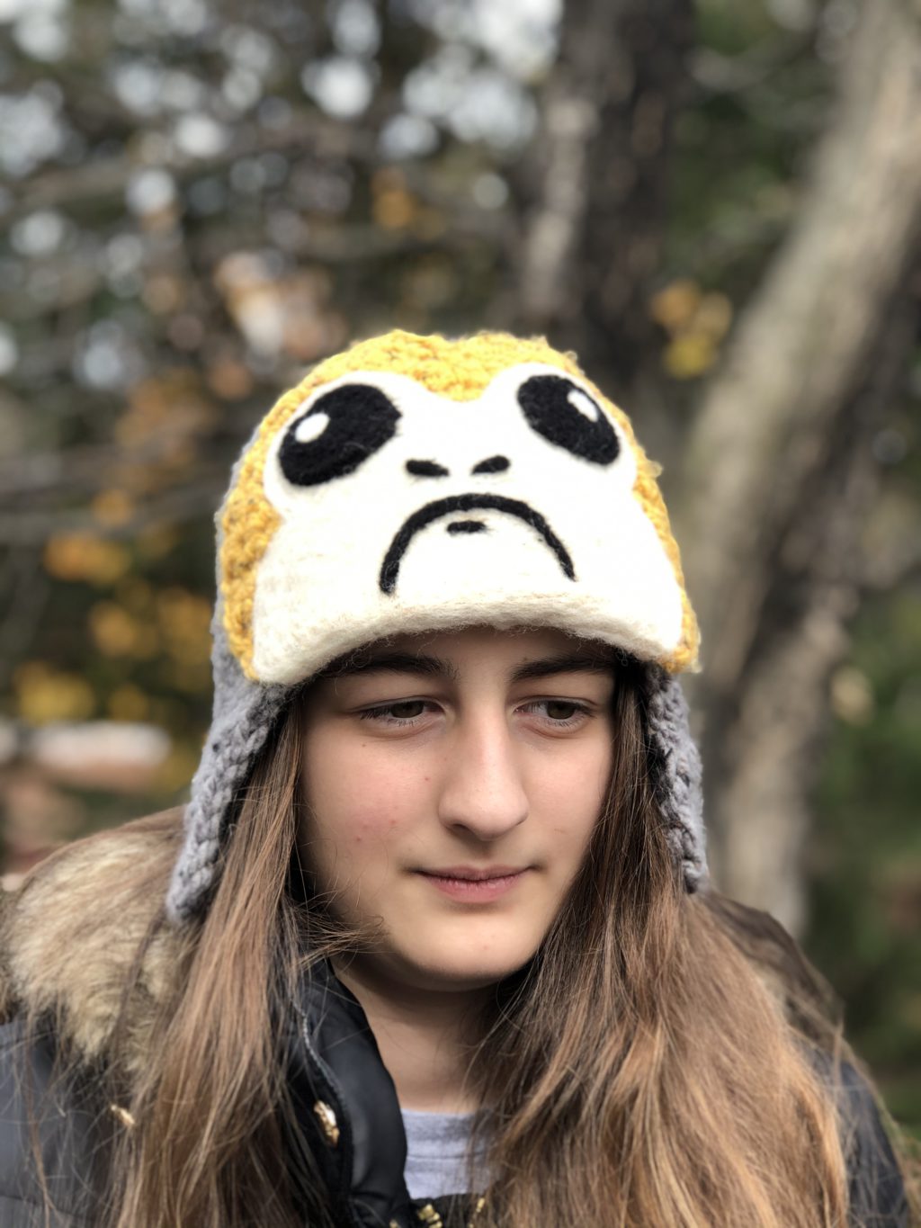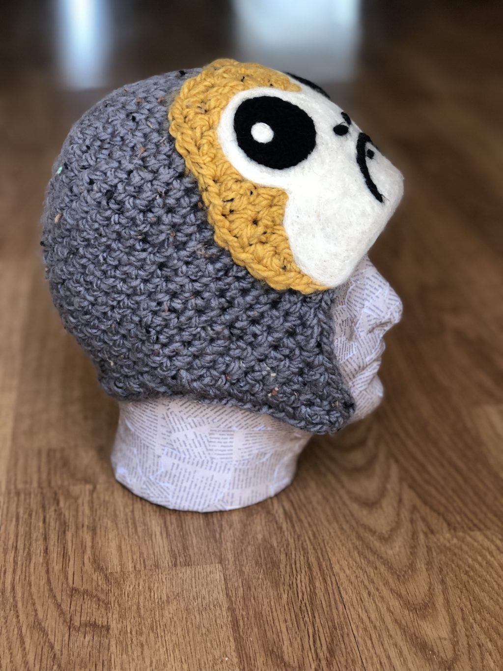 This hat is crocheted and needle felted on top, for the face details. It has ear flaps to keep your ears warm.